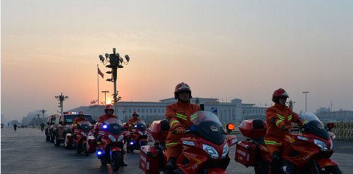 據(jù)報道 北京天安門配置新型消防摩托消防裝備。
