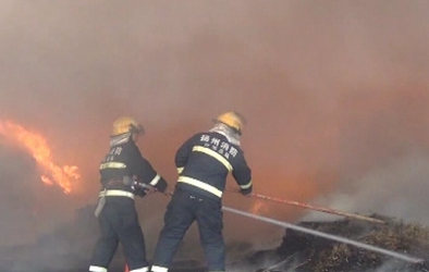 江蘇省揚州市一處堆放竹條的倉庫突然起火,風干的竹條大面積燃燒,濃煙籠罩,當?shù)叵啦块T接警,立即前往撲救。